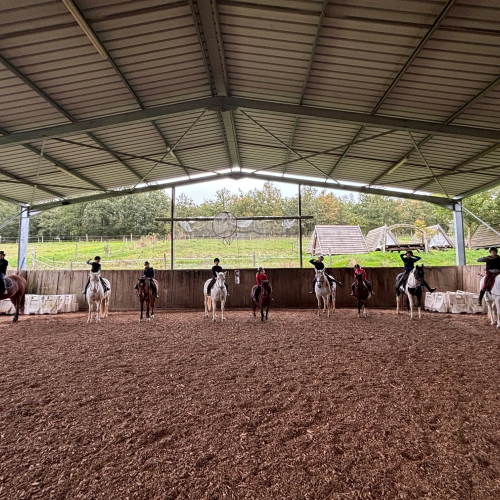 Cours d'initiation et d'enseignement par groupe de cavaliers de même niveau.